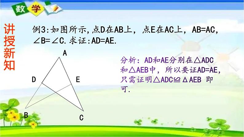 例3:如图所示,点D在AB上,点E在AC上,AB=AC, ∠B=∠C.求证:AD=AE.