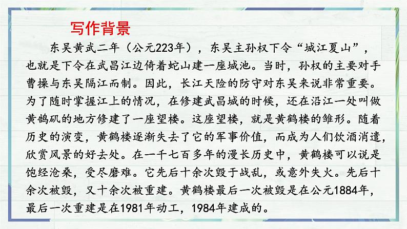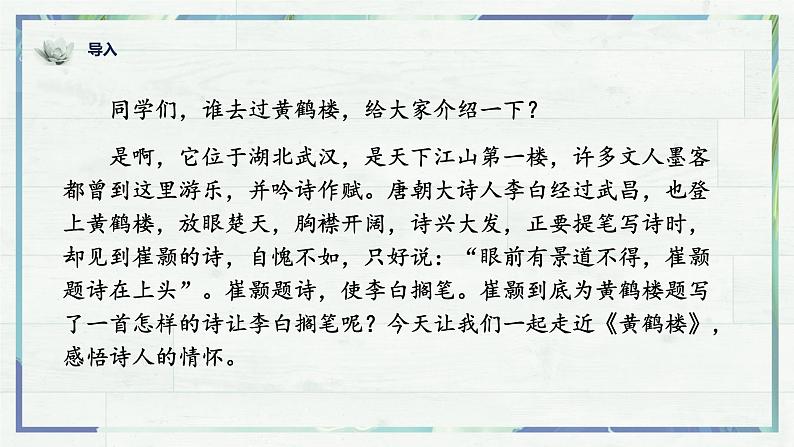 展开导入 同学们,谁去过黄鹤楼,给大家介绍一下? 是啊,它位于湖北武汉,是天下江山第一楼,许多文人墨客都曾到这里游乐,并吟诗作赋。唐朝大诗人李白经过武昌,也登上黄鹤楼,放眼楚天,胸襟开阔,诗兴大发,正要提笔写诗时,却见到崔颢的诗,自愧不如,只好说:“眼前有景道不得,崔颢题诗在上头”。崔颢题诗,使李白搁笔。崔颢到底为黄鹤楼题写了一首怎样的诗让李白搁笔呢?今天让我们一起走近《黄鹤楼》,感悟诗人的情怀。黄鹤楼崔颢学习目标Contents1231、背诵并课后默写这首诗。2、理解诗歌的内容,体会诗歌所描绘的意境和诗人的思想感情。3、体味情景交融的特点和遣词造句的妙处。 崔颢,汴州(开封)人氏,(公元704?—754年)唐玄宗开元11年(公元723年)进士。他才思敏捷,长于写诗,系盛唐诗人,《旧唐书·文苑传》把他和王昌龄、高适、孟浩然并提,但他宦海浮沉,终不得志。历史上对他的记述不多,故里汴州也很少有关他的传说和故事流传下来,旧《唐书·崔颢传》里非常简略,连他文学上的成就也未提及 。以《黄鹤楼》诗,颇令李白折服。从诗意看,崔颢还是思念故乡,并有回乡归隐、急流勇退之意的。然终因他功名心切,仍然回到长安,死于唐天宝十三年(754年),未得返回故里。这可能正是崔颢的故事在开封流传不多的主要原因。作者简介 唐代诗人崔颢的题咏,使黄鹤楼赢得“天下江山第一楼”的美誉。《黄鹤楼》这首诗运用了优美的神话传说,写出黄鹤楼的来历、登楼所见以及触景生情引起的乡愁。宋代人把这首诗推为唐人七律第一。 唐朝大诗人李白经过武昌,也登上黄鹤楼,放眼楚天,胸襟开阔,诗兴大发,正要提笔写诗时,却见到崔颢的诗,自愧不如,只好说:“眼前有景道不得,崔颢题诗在上头”。崔颢题诗,使李白搁笔,崔颢从此名气大盛。大约黄鹤楼边的“搁笔亭”就是因此而建的。 写作背景 东吴黄武二年(公元223年),东吴主孙权下令“城江夏山”,也就是下令在武昌江边倚着蛇山建一座城池。当时,孙权的主要对手曹操与东吴隔江而制。因此,长江天险的防守对东吴来说非常重要。为了随时掌握江上的情况,在修建武昌城的时候,还在沿江一处叫做黄鹄矶的地方修建了一座望楼。这座望楼,就是黄鹤楼的雏形。随着历史的演变,黄鹤楼逐渐失去了它的军事价值,而成为人们饮酒消遣,欣赏风景的好去处。在一千七百多年的漫长历史中,黄鹤楼可以说是饱经沧桑,受尽磨难。它先后十余次毁于战乱,或意外失火。先后十余次被毁,又十余次被重建。黄鹤楼最后一次被毁是在公元1884年,最后一次重建是在1981年动工,1984年建成的。写作背景黄鹤楼图片朗读诗歌黄鹤楼 崔 颢 昔人/已乘/黄鹤去,此地/空余/黄鹤楼。 黄鹤/一去/不复返,白云/千载/空悠悠。 晴川/历历/汉阳树,芳草/萋萋/鹦鹉洲。 日暮/乡关/何处是? 烟波江上/使人/愁。读懂诗意首联:昔人已乘黄鹤去,此地空余黄鹤楼。离开只剩下,仅留下指传说中骑鹤飞去的仙人传说仙人已乘黄鹤飞去,这里只留下空空的黄鹤楼。颔联:黄鹤一去不复返,白云千载空悠悠。飘飘荡荡的样子返回黄鹤飞去不会再回来了,而千百年来白云却依旧悠然自得地飘来飘去。黄鹤一去不复返,白云千载空悠悠。颈联:晴川历历汉阳树,芳草萋萋鹦鹉洲。晴日里的原野,川:平川、原野清晰的样子香草,古时常用于比作愁思草木茂盛的样子登楼隔江相望,汉阳的树木清晰可见,鹦鹉洲上的春草长得茂盛喜人。晴川历历汉阳树,芳草萋萋鹦鹉洲。尾联:日暮乡关何处是?烟波江上使人愁。故乡黄昏中眺望远方,故乡在哪儿呢?烟雾笼罩的长江更是激起思乡的哀愁。日暮乡关何处是?烟波江上使人愁。诗歌首联扣题,从神话传说落 笔,可谓起笔高远。诗人先悬想“昔日”仙人费祎乘黄鹤经过这里的情景 ,再从遥远的古代回到现实中来,写现在的鹤去楼空。一个“空”字,似有无限的感慨。读首联,仿佛看到诗人凭栏远眺, 吊古伤今陷入无限沉思之中的形象。昔人已乘黄鹤去,此地空余黄鹤楼。 颔联紧承首联来写,是首联的延伸。黄鹤己经飞走了,“一去不复返”。诗人似在极目远望,试图追寻黄鹤的踪影,却杳然无得;看到的只有天际飘浮的白云,这些白云,千百年来都是这样悠悠闲闲地浮动着。这两联四句,虚中有实,抚今追昔,写出诗人对世事变化难以逆料的感慨;以神话传说起笔,增添了黄鹤楼的神异色彩,大大丰富了诗歌的 内容。两个”空”字,怅惘之情然可见。黄鹤一去不复返,白云千载空悠悠。 颈联转写登楼所见之明丽之景,诗人也从怀古之思中回到现实中来。在和煦的阳光照耀下,长江对岸的汉阳平野中那一棵棵葱翠树木,清晰可辨:江中的鹦鹉洲上,芳草如茵,长得非常茂盛,此联所写为登高所见,境界远大,色彩鲜明,两句对仗工整,各用一个叠词,声调铿锵,音韵清朗,富于音乐美。晴川历历汉阳树,芳草萋萋鹦鹉洲。 尾联以抒情作结,诗人观赏佳景,吊古伤今,思緒绵绵,不觉已是傍晚,烟雾升腾,明净的江面,早已是一片凄迷,白日里可一望千里,历历在目;但现在凝眸远望,己不知乡关何处,漂泊异乡的人,见此情此景,不禁惹动满怀愁绪,这一联由景生情,形象鲜明,诗人凭栏远望,故乡却为暮霭所隔,望不可见而生无限愁思的形象仿佛可见。日暮乡关何处是,烟波江上使人愁。 诗歌题为《黄鹤楼》,处处写楼,悬想乘鹤仙人,是写黄鹤楼之悠久历史与神异色彩,黄鹤杳然