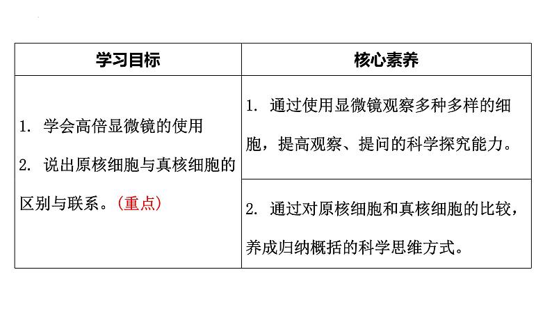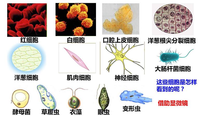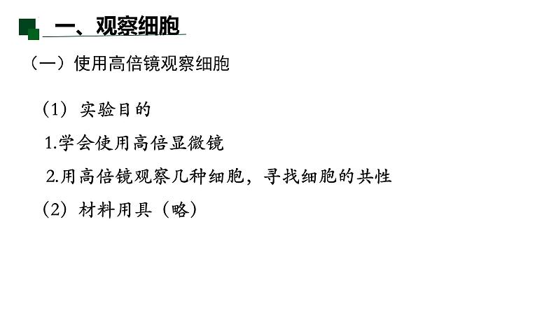 (1)实验目的1.学会使用高倍显微镜 2.用高倍镜观察几种细胞,寻找细胞的共性(2)材料用具(略)