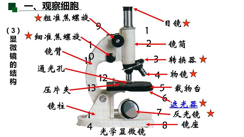 (1)用高倍镜观察时,禁止调粗准焦螺旋,否则会压坏物镜。