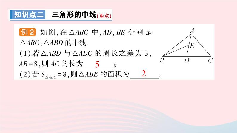 这是一份数学八年级上册第十一章 三角形11.1 与三角形有关的线段11.1.2 三角形的高、中线与角平分线教学课件ppt,共21页。PPT课件主要包含了回忆与思考,用几何符号表示为,范例学习,新知运用2等内容,欢迎下载使用。