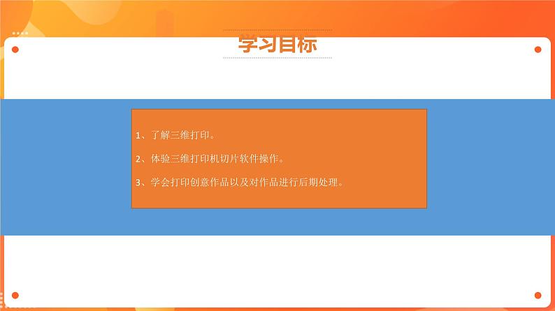 1、了解三维打印。2、体验三维打印机切片软件操作。3、学会打印创意作品以及对作品进行后期处理。