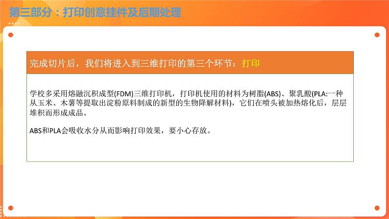 学校多采用熔融沉积成型(FDM)三维打印机,打印机使用的材料为树脂(ABS)、聚乳酸(PLA:一种从玉米、木薯等提取出淀粉原料制成的新型的生物降解材料),它们在喷头被加热熔化后,层层堆积而形成成品。ABS和PLA会吸收水分从而影响打印效果,要小心存放。