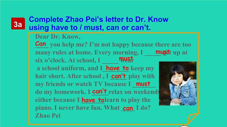 Cmplete Zha Pei’s letter t Dr. Knwusing have t / must, can r can’t.
