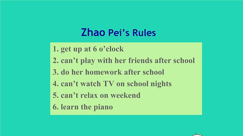 1. get up at 6 ’clck2. can’t play with her friends after schl3. d her hmewrk after schl4. can’t watch TV n schl nights5. can’t relax n weekend6. learn the pian