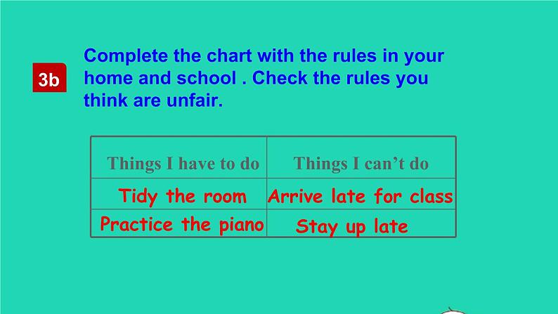 这是一份人教新目标 (Go for it) 版七年级下册Section B完美版ppt课件,文件包含人教新目标版英语七下Unit4《Don’teatinclass》SectionB3a-selfcheck课件pptx、Followtherules视频mp4等2份课件配套教学资源,其中PPT共34页, 欢迎下载使用。