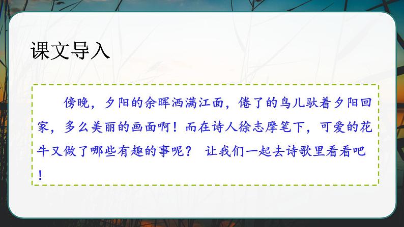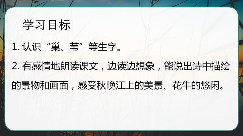 展开1. 认识“巢、苇”等生字。2. 有感情地朗读课文,边读边想象,能说出诗中描绘的景物和画面,感受秋晚江上的美景、花牛的悠闲。