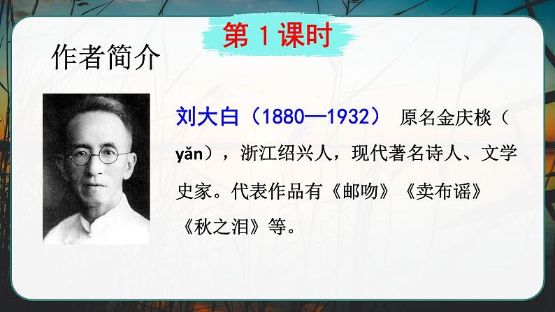 刘大白(1880—1932) 原名金庆棪(yǎn),浙江绍兴人,现代著名诗人、文学史家。代表作品有《邮吻》《卖布谣》《秋之泪》等。