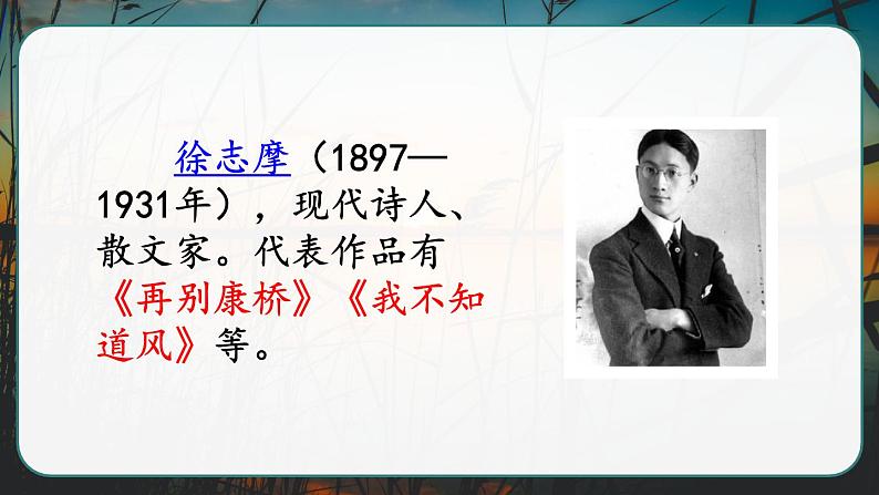 徐志摩(1897—1931年),现代诗人、散文家。代表作品有《再别康桥》《我不知道风》等。