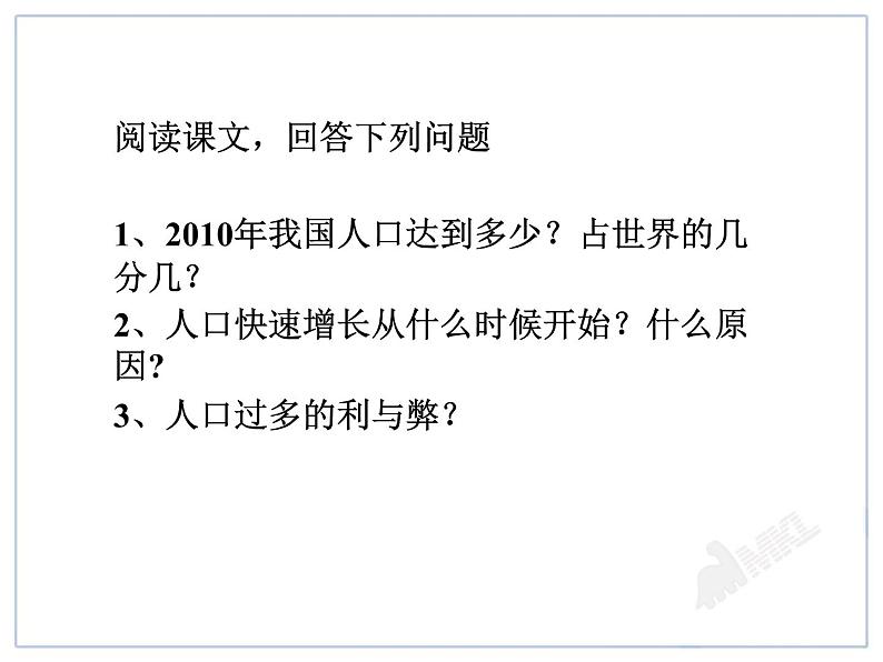 阅读课文,回答下列问题1、2010年我国人口达到多少?占世界的几分几?2、人口快速增长从什么时候开始?什么原因?3、人口过多的利与弊?