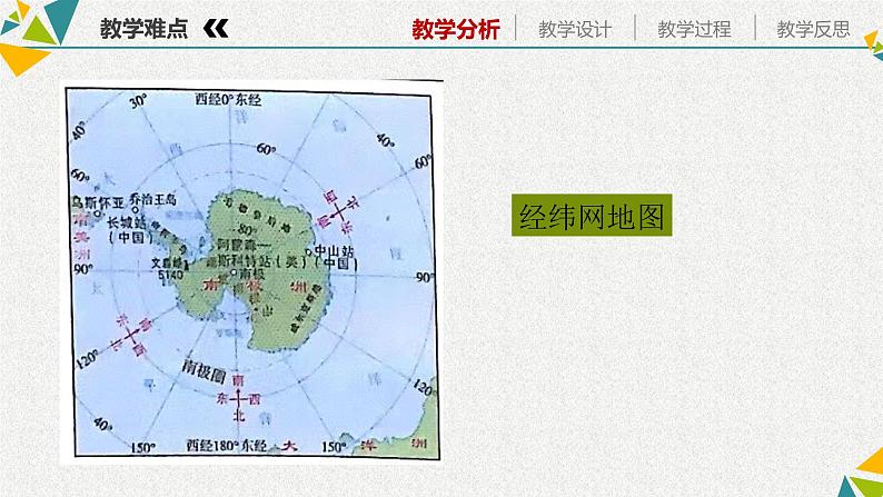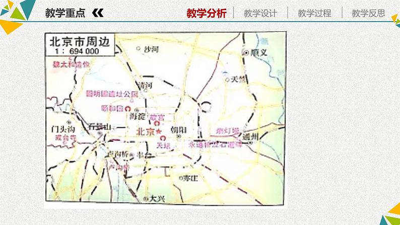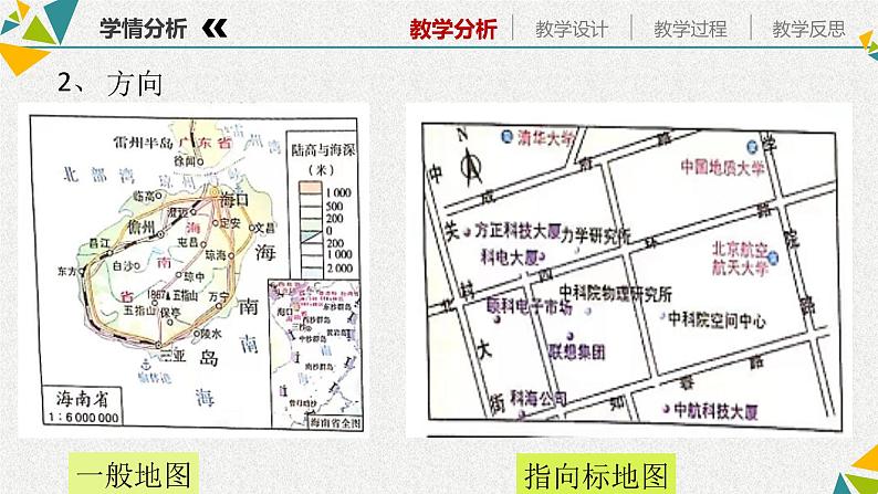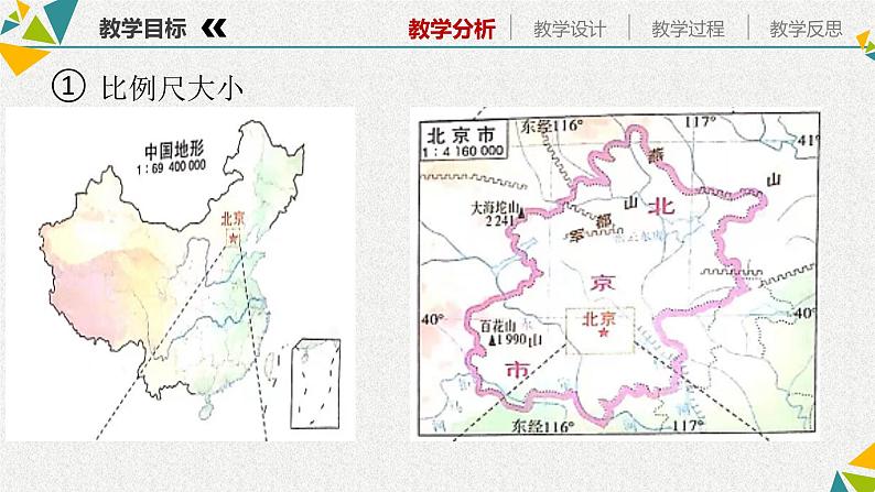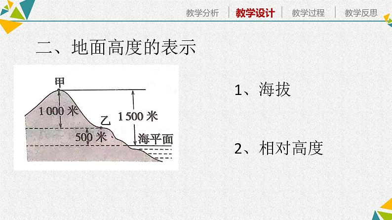 第二节、地图、等高线地形图判读与地形剖面图课程结构3、根据等高线绘制剖面图2.等高线的特点,判读。1、比例尺的的认识、判读、计算。教学内容一、比例尺的认识:概念:表示图上距离比实际距离缩小的程度公式:比例尺=图上距离/实地距离。1、2、3、表现形式文字式数字式线段式教学目标①比例尺大小教学重点学情分析2、方向一般地图指向标地图教学难点经纬网地图二、地面高度的表示1、海拔2、相对高度三、等高线地形度1、等高线在地图上把海拔相等的点连接而成的先线2、等高线地形图的基本特征1)同线等高2)同图等距3)密图疏缓4)凸低为脊5)凸高为谷6)重叠为涯山丘山峰*等高线闭合,外低内高。*图中线段为示坡线,示坡线画在等高线外侧,坡度向外侧降低。课前准备盆 地*闭合等高线,外高内底。*线段为示坡线,示坡线 画在等高线内侧坡度向内测降低。课前准备山 脊 *等高线凸向低处,中间高于两侧*虚线为山脊线,也为分水线课堂实施山 谷*等高线,凸向高处,中间低于两侧*虚线为集水线,河流沿此处向外流出。课堂实施鞍 部*两组山峰等高线之间的区域*鞍部是山谷线最高处,山脊线最低处课堂实施陡 涯*多条等高线重叠在一处*在等高线重叠出,用一组与等高线垂直的示线坡表示平 原等高线稀疏,等高线数值小。丘 陵*类似山地,等高线值小*与山地类似,以数值进行区别梯 田*海拔较低*等高线稀疏和密集处差别大。月牙形沙丘*等高线形似新月*相对高度小,凹坡等高线密,凸坡等高线稀疏火 山*从示坡线或海拔变化可判断火山口*等高线先增后减,形状近似圆形。冲积扇*等高线呈圆弧形,并上密下疏。*多有放射状河流或季节河流*等高线稀疏处数值小;山峰等高线密集平滑*多山间盆地(坝子)山多陡峭孤峰喀斯特地貌黄图高原*等高线稀疏的地方数值高*顶部平坦,边缘处沟谷纵横四、地形剖面图含义:以等高线地形图为基础转绘成的,它反应了在等高线地形图上按某条直线下切显露出来的地形垂直剖面状况谢谢您的聆听