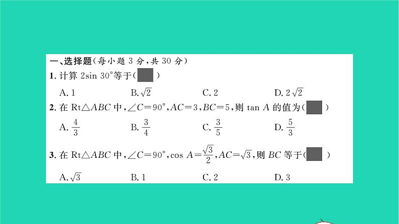 展开周周卷(六)锐角三角函数与解直角三角形测试范围:下册1.1~1.4