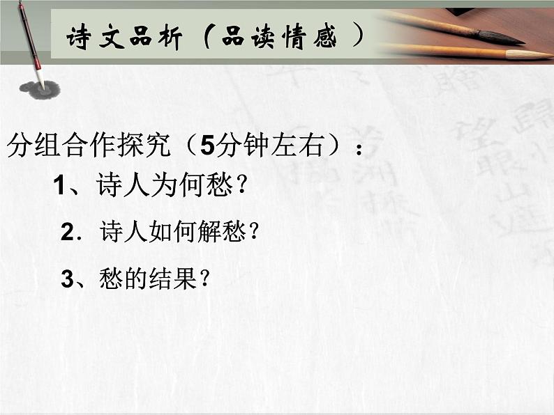 分组合作探究(5分钟左右): 1、诗人为何愁? 2.诗人如何解愁? 3、愁的结果?