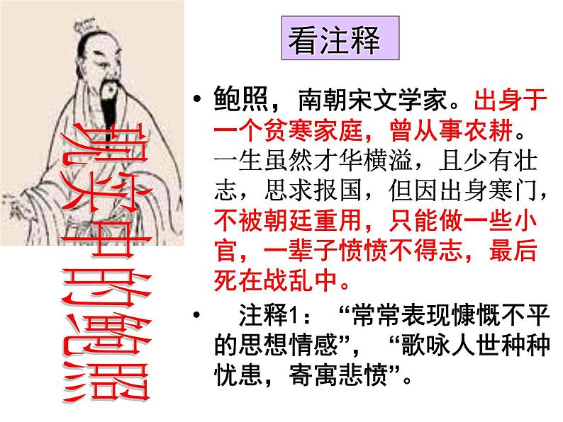 鲍照,南朝宋文学家。出身于一个贫寒家庭,曾从事农耕。一生虽然才华横溢,且少有壮志,思求报国,但因出身寒门,不被朝廷重用,只能做一些小官,一辈子愤愤不得志,最后死在战乱中。 注释1: “常常表现慷慨不平的思想情感”, “歌咏人世种种忧患,寄寓悲愤”。