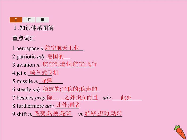 1.aerspace n. 2.patritic adj. 3.aviatin n. 4.jet n. 5.missile n. 6.steady adj. 7.besides prep. adv. 8.furthermre adv. 9.shift n. vt.