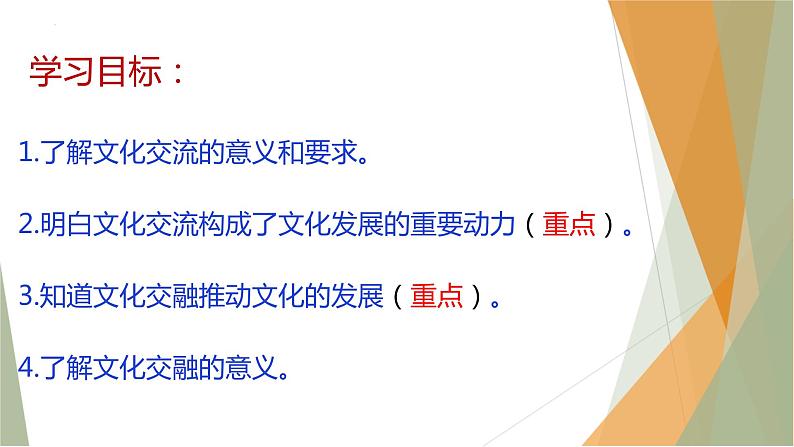 这是一份人教统编版必修4 哲学与文化文化交流与文化交融集体备课ppt课件,共31页。PPT课件主要包含了学习目,学习重难,文化交流,中外文化交流的意义,文化交流与文化发展,文化交融,文化交融与文化发展,巩固练习,课后作业等内容,欢迎下载使用。