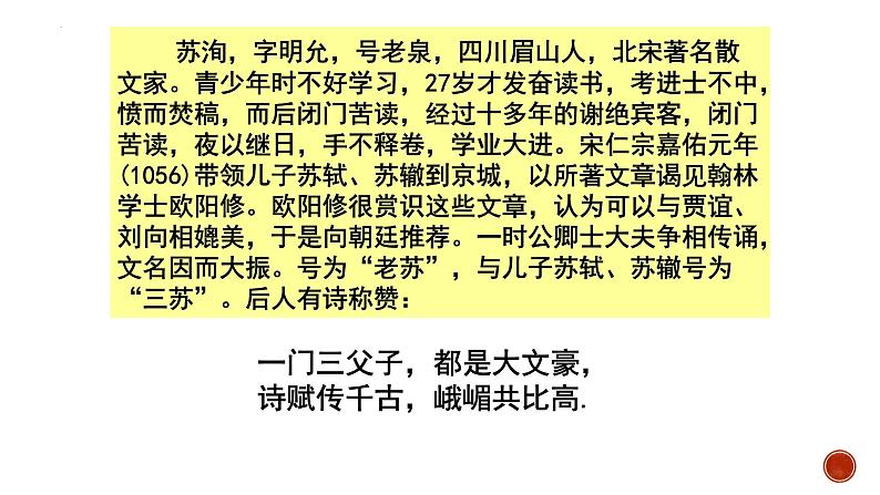 苏洵,字明允,号老泉,四川眉山人,北宋著名散文家。青少年时不好学习,27岁才发奋读书,考进士不中,愤而焚稿,而后闭门苦读,经过十多年的谢绝宾客,闭门苦读,夜以继日,手不释卷,学业大进。宋仁宗嘉佑元年(1056)带领儿子苏轼、苏辙到京城,以所著文章谒见翰林学士欧阳修。欧阳修很赏识这些文章,认为可以与贾谊、刘向相媲美,于是向朝廷推荐。一时公卿士大夫争相传诵,文名因而大振。号为“老苏”,与儿子苏轼、苏辙号为“三苏”。后人有诗称赞: