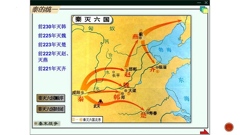 前230年灭韩 前225年灭魏 前223年灭楚 前222年灭赵、灭燕 前221年灭齐