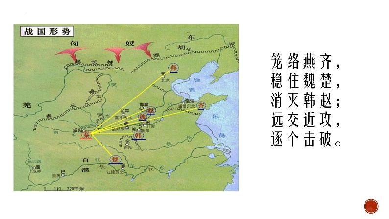 笼络燕齐,稳住魏楚,消灭韩赵;远交近攻,逐个击破。