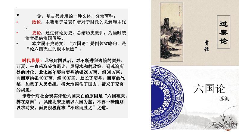 论,是古代常用的一种文体,分为两种: 政论,主要用于发表作者对于时政的见解和主张 。 史论,通过评论历史,总结历史教训,为当时统治者提供治国借鉴。 本文属于史论文。“六国论”是倒装省略句,是“论六国灭亡的根本原因”。 时代背景:北宋建国以后,对不断进犯边境的契丹、西夏,一直采取妥协退让、屈辱求和的政策。到苏洵所处的时代,北宋每年要向契丹纳银20万两,绢30万匹;向西夏纳银10万两,绢10万匹,助长了契丹、西夏的气焰,加重了人民负担,极大地损伤了国力,带来了无穷的祸患。 作者针对社会现实评论六国灭亡的原因是“六国破灭,弊在赂秦”,讽谏北宋王朝以六国为鉴,不要一味贿赂以求苟安,而要积极谋求“不赂而胜之”之道。