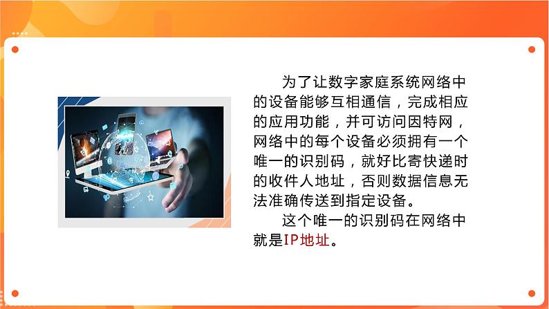 为了让数字家庭系统网络中的设备能够互相通信,完成相应的应用功能,并可访问因特网,网络中的每个设备必须拥有一个唯一的识别码,就好比寄快递时的收件人地址,否则数据信息无法准确传送到指定设备。 这个唯一的识别码在网络中就是IP地址。
