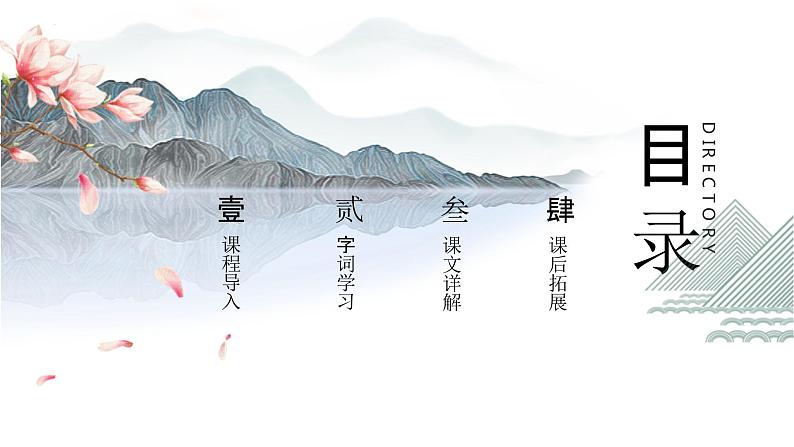 10 日月潭部编版二年级上册第一课时目录DIRECTORY课程导入壹字词学习贰课文详解叁课后拓展肆一、课程导入 同学们,你们喜欢旅游吗?大家都去过哪里?你们当时的心情怎样?请欣赏几张美丽的风景图片看看这是哪里的风景?二、字词学习 tán hú rào mào shèng wéi yāng dǎo huá shā tóng jìng yǐn kè míng shèng jì lì huá zhǎn xiàn pī小 岛 展 现 建 筑 轻 轻 环 绕 名胜古迹 隐隐约约 台湾省 树木茂盛 湖水围绕名胜中央小岛光华岛隐隐约约面纱童话仙境吸引客人群山环绕名声古迹点点灯光树木茂盛山清水秀蒙蒙细雨倒薄名míng 书写指导:“夕”的第一笔较短,横撇的撇较长;下面“口”较扁。名胜古迹 有名造句:北京有许多的名胜古迹。 央yāng 书写指导:第一笔竖短,横长,撇捺舒展。中央 当央造句:屋子中央有一个圆形的桌子。 丽lì 书写指导:第一笔横宜长,下部紧凑。美丽 秀丽造句:美丽的春天已经来到我们身边。 华huá 书写指导:“化”笔画紧凑,横长,竖为悬针竖。光华 华灯造句:日月潭湖水中央的小岛叫光华岛。 迹 jì 书写指导:“辶”捺舒展,“亦”笔画紧凑。古迹 陈迹造句:天坛是北京城的名胜古迹。 展zhǎn 书写指导:“尸” 撇向左下长伸,捺舒展。展开 展翅造句:这是一个可以充分展现自我的舞台。 行小船环绕:茂盛:名胜古迹:围在周围。造句:清澈见底的小河环绕着这个宁静祥和的小村庄。形容植物生长得多而茁壮。造句:原始森林的树木生长得非常茂盛。有古迹或优美风景的著名的地方。造句:我的家乡有许多名胜古迹,是旅游胜地。隐隐约约:清晰:展现:模模糊糊,看不清。造句:薄雾中隐隐约约可以看见几个人影。 清楚明晰。 造句:大雨过后,晴空万里,远处的景物清晰可见。 展示、明显表现出来的意思。 造句:姐姐越来越展现出具有唱歌的天赋。理解词语三、课文详解自读提示用自己喜欢的方式读课文,标出生字词、读准字音。本文用优美的语言介绍了日月潭地理位置名字由来秀丽风光第一部分(第1自然段)交代日月潭的地位、地理位置和周围的环境。第二部分 (第2-4自然段)写日月潭名字的由来和清晨、中午晴天及雨天日月潭的美丽景色。第三部分(第5自然段)日月潭吸引了很多游客。
