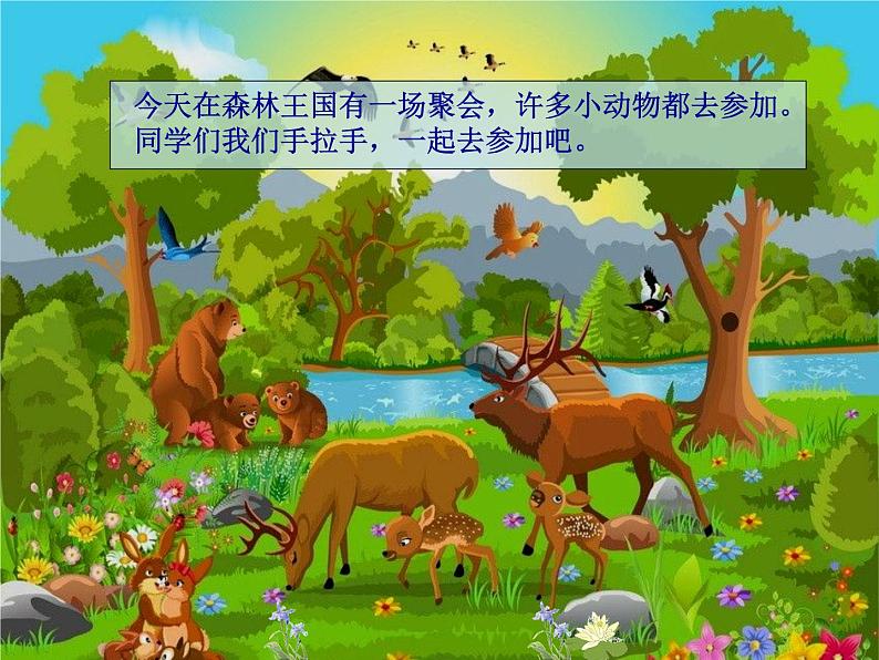 今天在森林王国有一场聚会,许多小动物都去参加。同学们我们手拉手,一起去参加吧。