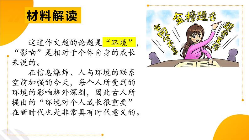 这是一份“环境·个人·成长”作文讲评课件(42张PPT),共41页。PPT课件主要包含了材料解读,简单问题复杂化,行文结构套路化,热点话题边缘化,考情分析与命题趋势,命题者意图,任务要求,审题立意部分,偏题立意,参考立意等内容,欢迎下载使用。