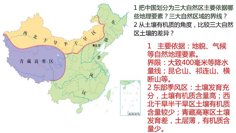 1 主要依据:地貌、气候等自然地理要素。界限:大致400毫米等降水量线;昆仑山、祁连山、横断山等。2 东部季风区:土壤发育充分,土壤有机质含量高;西北干旱半干旱区土壤有机质含量较少;青藏高寒区土壤发育差,土层薄,有机质含量少。