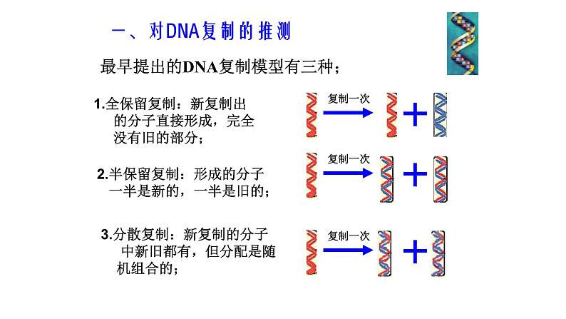 3.分散复制:新复制的分子 中新旧都有,但分配是随 机组合的;