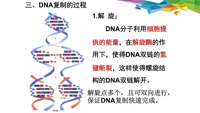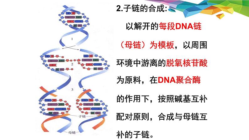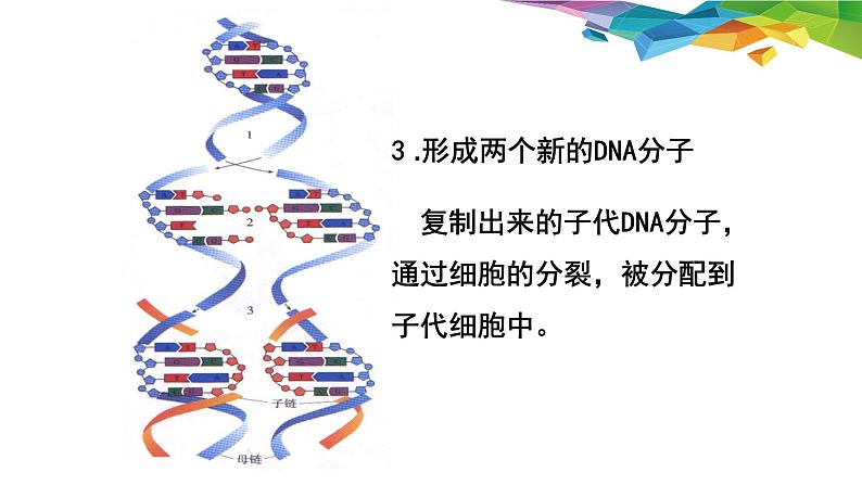 3 .形成两个新的DNA分子 复制出来的子代DNA分子,通过细胞的分裂,被分配到子代细胞中。