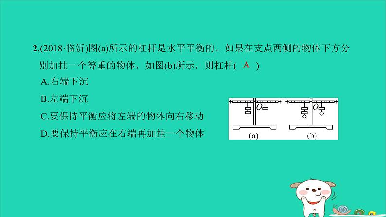 2.(2018·临沂)图(a)所示的杠杆是水平平衡的。如果在支点两侧的物体下方分别加挂一个等重的物体,如图(b)所示,则杠杆( )