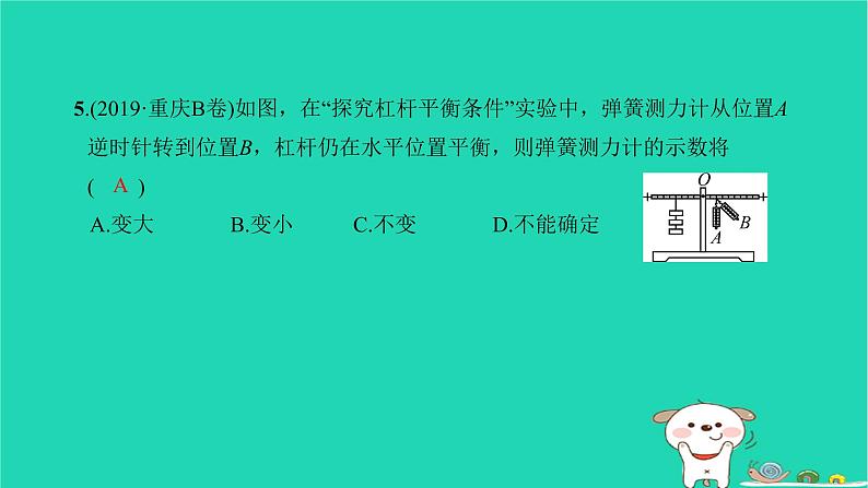 5.(2019·重庆B卷)如图,在“探究杠杆平衡条件”实验中,弹簧测力计从位置A逆时针转到位置B,杠杆仍在水平位置平衡,则弹簧测力计的示数将 ( )