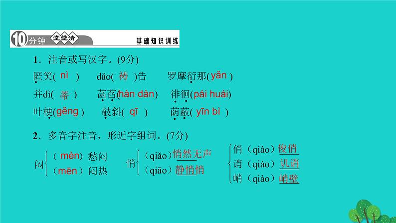 1.注音或写汉字。(9分)匿笑( ) dǎ( )告 罗摩衍那( )并dì( ) 菡萏( ) 徘徊( )叶梗( ) 攲斜( ) 荫蔽( )