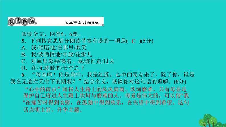 阅读全文,回答5、6题。5.下列按意思划分朗读节奏有误的一项是( )(5分)A.我/暗暗地/在那里/匿笑B.我/要悄悄地/开放/花瓣儿C.对屋里母亲/唤着,我/连忙走/过去D.在/无遮蔽的/天空之下6.“母亲啊!你是荷叶,我是红莲。心中的雨点来了,除了你,谁是我在无遮拦天空下的荫蔽?”结合全文,谈谈你对这句话的理解。(6分)