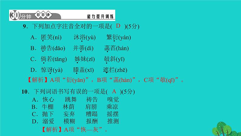 【解析】A项“衍(yǎn)”,B项“菡(hàn)”,C项“欹(qī)”。