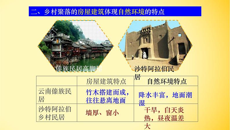这是一份2021学年第一框 乡村聚落教学ppt课件,共23页。PPT课件主要包含了乡村聚落,城市聚落,依山而建,傍水而居,散落状,傣族民居高脚屋,沙特阿拉伯民居,降水丰富地面潮湿,自然环境特点,皖南民居等内容,欢迎下载使用。