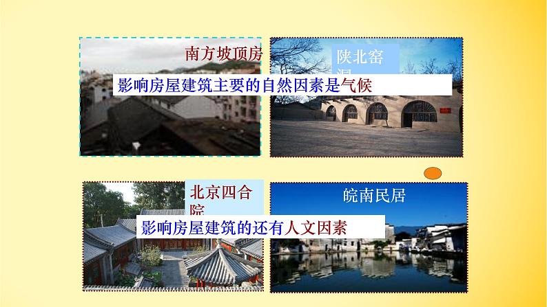1.分布、形态各具特色2.房屋建筑各具特色3.生产生活各具特色