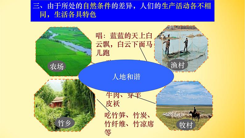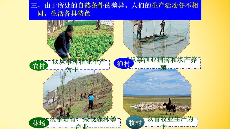 三、由于所处的自然条件的差异,人们的生产活动各不相同,生活各具特色