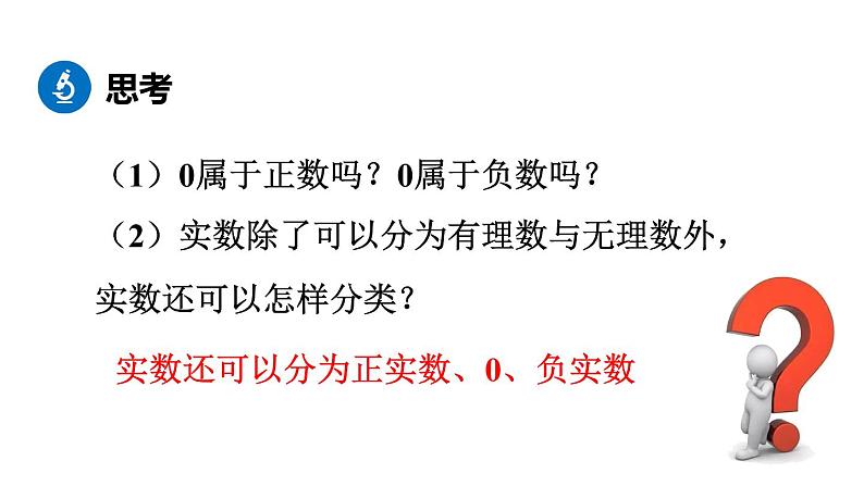 (1)0属于正数吗?0属于负数吗?(2)实数除了可以分为有理数与无理数外,实数还可以怎样分类?