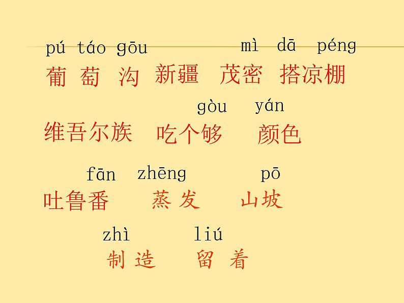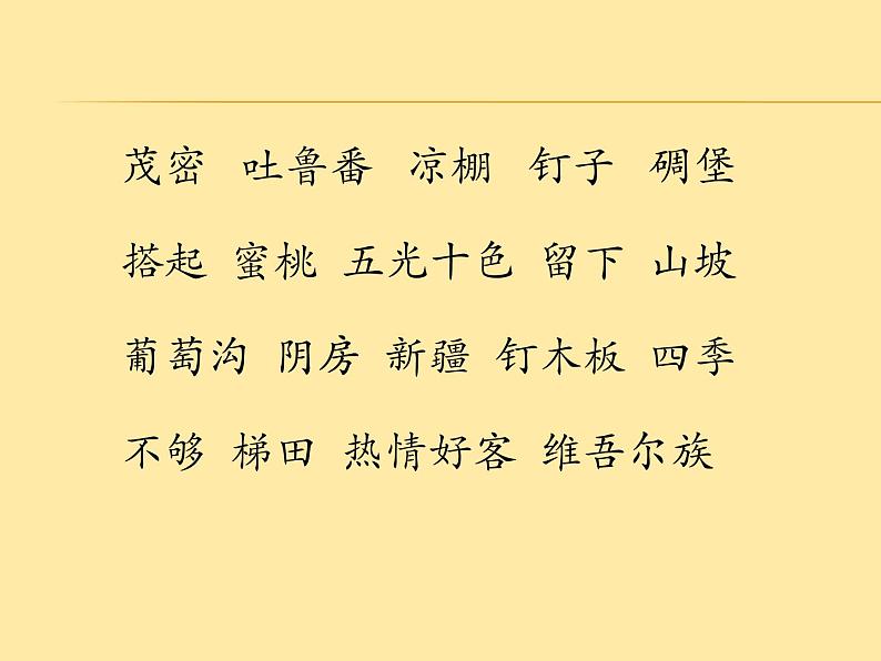 茂密 吐鲁番 凉棚 钉子 碉堡搭起 蜜桃 五光十色 留下 山坡葡萄沟 阴房 新疆 钉木板 四季不够 梯田 热情好客 维吾尔族