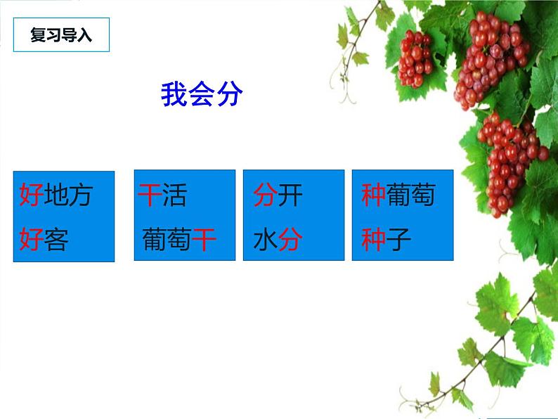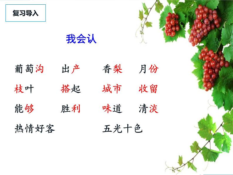 这是一份人教部编版二年级上册11 葡萄沟教学演示课件ppt,共18页。PPT课件主要包含了葡萄沟是个好地方吗,葡萄干,盛产水果,葡萄的枝叶,生长旺盛,葡萄美,五光十色,积累表示颜色的词语,热情好客,称赞葡萄甜等内容,欢迎下载使用。