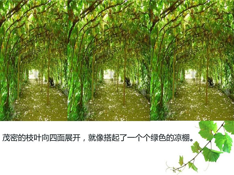 葡萄种在山坡的梯田上。茂密的枝叶向四面展开,就像搭起了一个个绿色的凉棚。到了秋季,葡萄一大串一大串挂在绿叶底下,有红的、白的、紫的、暗红的、淡绿的,五光十色,美丽极了。要是这时候你到葡萄沟去,热情好客的维吾尔族老乡,准会摘下最甜的葡萄,让你吃个够。