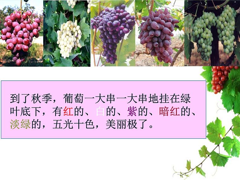 到了秋季,葡萄一大串一大串地挂在绿叶底下,有红的、白的、紫的、暗红的、淡绿的,五光十色,美丽极了。
