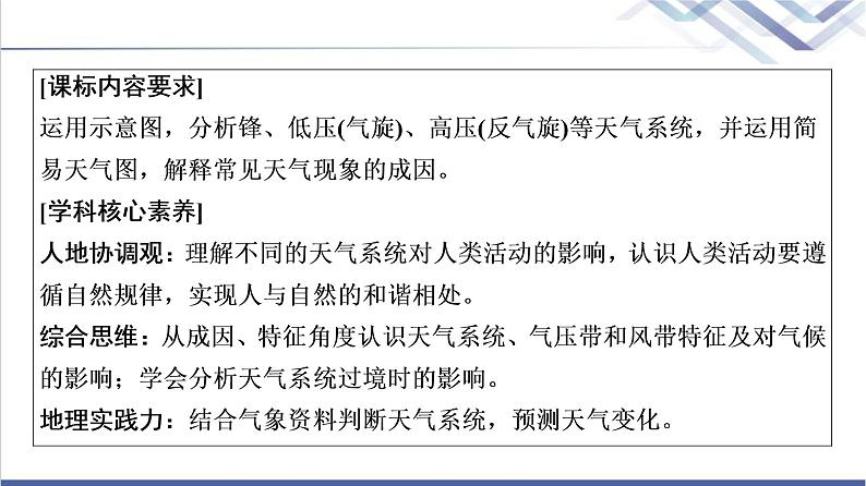 第二节 常见的天气系统第三单元 大气变化的效应01必备知识·落实基础性高于低于暖气团冷气团锋风、云、雨❺ 四周向中心辐合逆时针顺时针中心向四周辐散顺时针逆时针上升下降阴雨晴朗02关键能力·提升综合性考点一考点二点击右图进入…课时质量评价谢谢观看 THANK YOU!