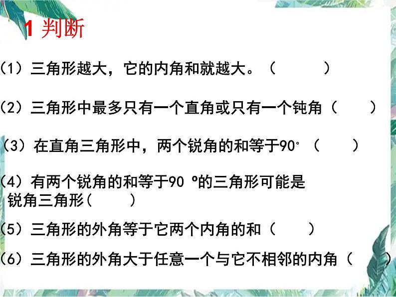 (2)三角形中最多只有一个直角或只有一个钝角( )