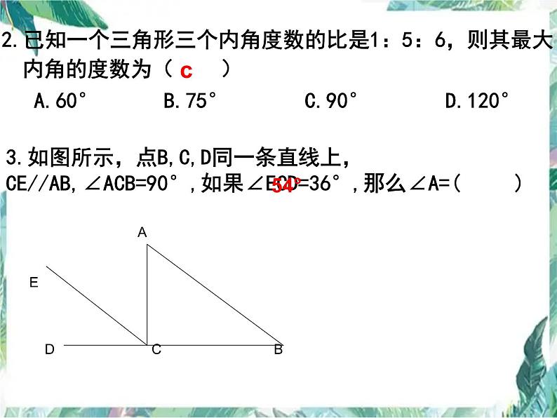 2.已知一个三角形三个内角度数的比是1:5:6,则其最大内角的度数为( ) A.60° B.75° C.90° D.120°