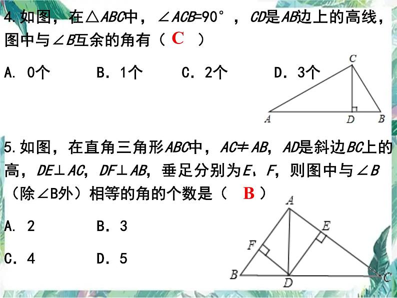 4.如图,在△ABC中,∠ACB=90°,CD是AB边上的高线,图中与∠B互余的角有( ) A. 0个 B.1个 C.2个 D.3个