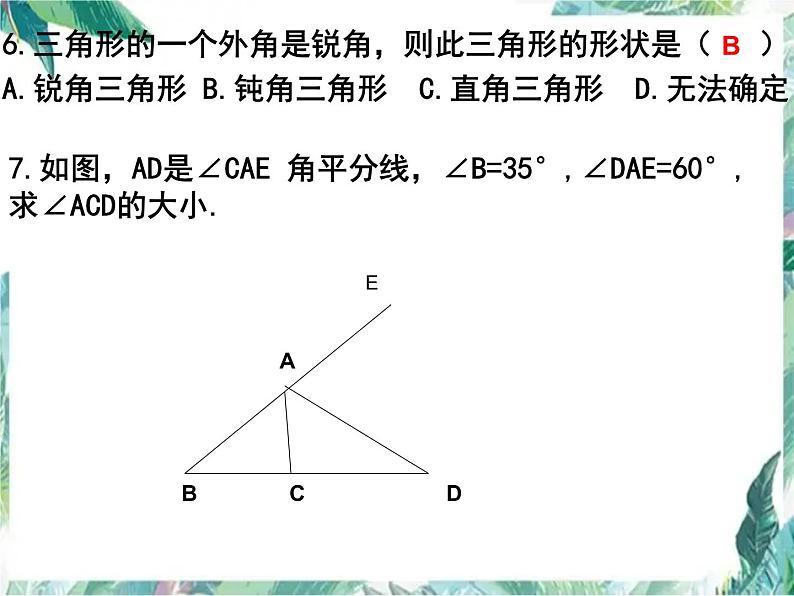 7.如图,AD是∠CAE 角平分线,∠B=35°,∠DAE=60°,求∠ACD的大小.