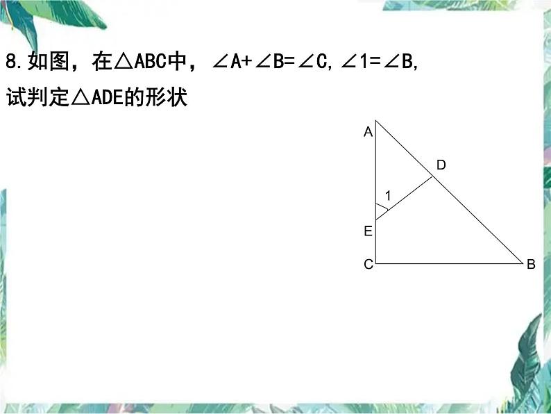 8.如图,在△ABC中,∠A+∠B=∠C,∠1=∠B,试判定△ADE的形状